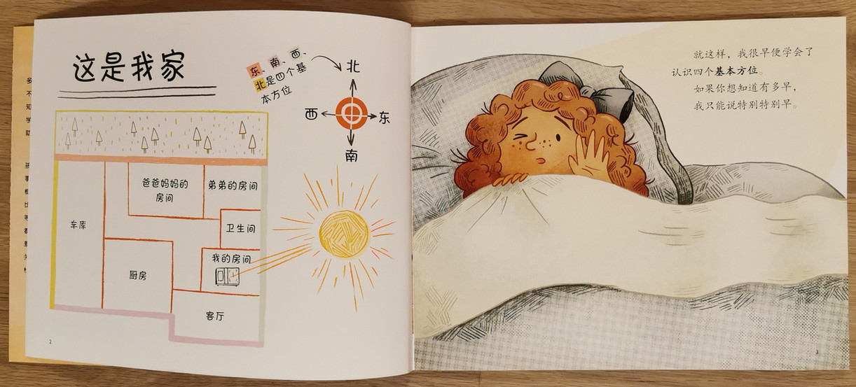 用自然又有趣的方式向孩子介绍了物与物的相对位置、距离等基本空间概念及其运用,这也是小小鸟喜爱的绘本。受绘本启发,那段时间里,她热衷于绘制自己的地图。除了为周围的真实环境绘制小小鸟版地图,她还为自己想象的魔法世界创作地图。