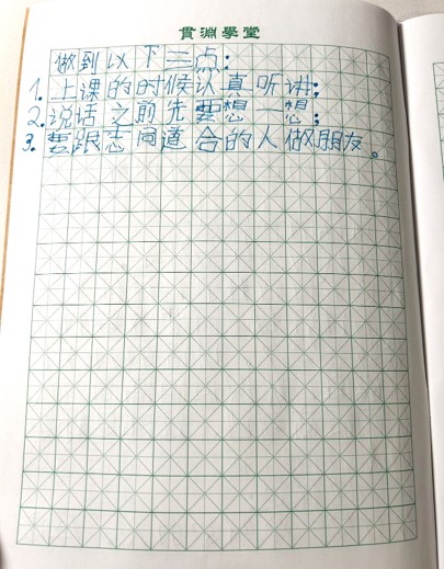 轮到的孩子,课前写书面稿,课上脱稿表达,课后交书面稿扫描版(原告自己留底)。写稿时,先抄一遍当天要解读的论语句子,然后解释这个句子,最后说说自己的看法。如果句中包含成语,抄一遍,解释之后,自己写一段话,用上这个成语。